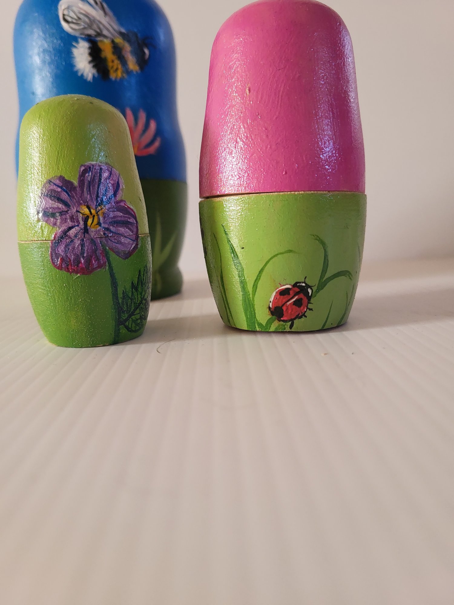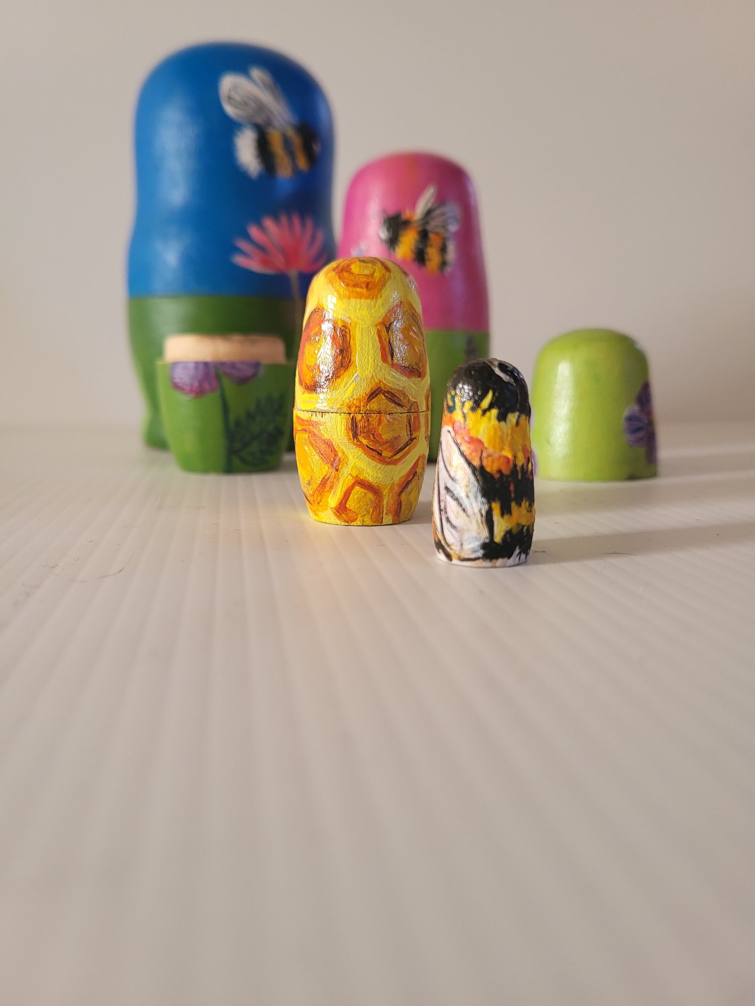 Set of 5 hand painted original wooden nesting pods, largest is 12cm. There is a video reel of them on both my Donna Connolly Art instagram and Meta pages